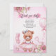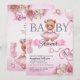 Baby shower invitation featuring an adorable watercolor illustration of a teddy bear in a cute pink dress.
