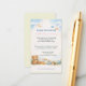 The soft pastel design includes clouds, stars, a moon, birds, a teddy bear, and whimsical baby items like bottles, shoes, and a hedgehog toy. This dreamy theme blends charm with functionality, perfect for rustic, whimsical, or pastel-inspired baby showers. With customizable details for date, time, and location, this card ensures every guest feels part of the celebration.