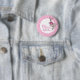 Cute whimsy grey kangaroo with a pouch full of pink hearts baby shower pin button badges with a white polka dot heart on pink outer rim. Edit these pin badges with your choice of name or other text. Modern simple graphic kangaroo art in shades of pink, gray and white. Ideal for a baby shower or showering party. A great personalized addition to your Baby shower festivities. Original drawing and graphic art and design by Sarah Trett www.sarahtrett.com for www.mylittleeden.com