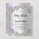 A modern, stylish baby shower invitation. A faux silver looking background with violet faux glitter, sparkles, lavender florals, flowers and eucalyptus greenery. Personalize and add the name and party details.
