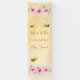 Elegant, fun, summer baby shower banner. Yellow, white background with a honeycomb pattern. Decorated with pink tropical florals flowers, hibiscus and happy bumble bees. With the text: Mom to Bee and the name of the mom-to-be. Personalize and add a name and a date.