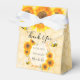A favor box for a summer Baby Shower, gender neutral. Yellow background with a honeycomb pattern. With a faux gold geometric frame. Decorated with rustic yellow and orange watercolored sunflowers and happy smiling bumble bees. With the text: Thank You and Mom to Bee written with a modern hand lettered style script. Personalize and add the name of the mom to bee's name and the date of the shower. Black letters.