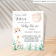 For a baby shower, gender neutral. A white background. A cute little baby giraffe, eucalyptus greenery, woodland ferns and a hyppy smiling moon. Personalize and add the name of the mom to-be's name and party details. Text: We are over the Moon, Baby Shower and the name are written with a hand lettered style script
