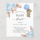 For a modern boho style baby shower. White background. Decorated with light blue florals, roses, pampas grass and a teddy bear boy holding a blue balloon. Personalize and add a name and party details.