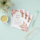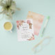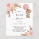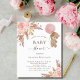 For a modern boho style baby shower. White background on the front. Decorated with rose gold and pink florals, roses, pampas grass and a teddy bear girl holding a pink balloon. Personalize and add a name and party details.