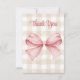 Express your gratitude in style with this elegant baby shower thank you card, featuring a classic beige gingham background and a charming pink watercolor bow. Perfect for a bow-themed girl’s baby shower, this card captures the sweetness of your celebration with a heartfelt message: "Thank you for tying our day together with love and joy! Your thoughtful gift and presence made our little girl's bow-tiful celebration even more special. We're so grateful to have you in our lives as we welcome our baby girl with open arms and lots of bows!" Personalize the inside with your own message to make it uniquely yours. This custom thank you card is the perfect way to share your appreciation with loved ones, adding a touch of charm to your special occasion.
