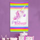 Unicorn head with horn and pink and purple mane whimsy watercolor art on a graphic stripe rainbow gift display banner. Ideal to mark gift display shower area and to help guests enjoy viewing the gift items on display. Other matching items available. Original unicorn art and design by Sarah Trett for www.mylittleeden.com