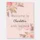 A welcome board for a Baby Shower, celebrating a baby girl. A rose gold gradient background decorated with pink roses, florals, pampas grass and a large butterfly. Personalize and add a name.