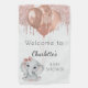 A welcome flag for a Baby Shower, celebrating a baby girl. A white background decorated with rose gold faux glitter drips, paint dripping look, balloons and a cute elephant baby girl. Personalize and add a name.