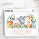 Watercolor Safari Animals Greenery Baby Shower Thank You Postcard. Baby Animals include Elephant, Monkey, Giraffe, Rhino, Zebra and Lion on fern leaves. Watercolor Botanical Greenery. Pink and Gold Text.