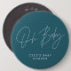 Baby shower script modern bright teal blue and white elegant party decor attire button design. Ideal contemporary minimal baby shower party design.