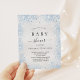 A modern, elegant baby shower, celebrating a baby boy. Faux silver metallic looking background decorated with blue faux glitter dust. Personalize and add a name and party details. Black colored letters.