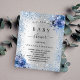A modern, elegant baby shower, celebrating a baby boy. Faux silver metallic looking background decorated with blue faux glitter, sparkles and blue florals, flowers. Personalize and add a name and party details. Black colored letters.