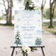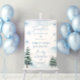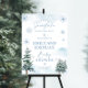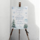 Baby shower blue winter wonderland welcome sign with snowflakes and pine trees.