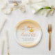 Cute baby shower stork delivering a new baby paper orange yellow party plates. Ideal for a special new baby showering party or event. Personalize with your mother to be name and wording. Currently reads A new baby is on the way dig in and honor mother-to-be Danielle MacDonald. Original watercolor whimsical art and design by Sarah Trett for www.mylittleeden.com