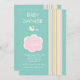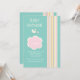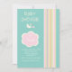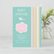 This cute, teal background shower invitation, with a border of pastel-colored stripes, features a stork and a pink cloud for a name or date.