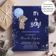 For a baby shower celebrating a baby boy. A navy blue background, the blue color is uneven. Decorated with faux silver glitter dust. A teddy bear holding a light blue balloon. Personalize and add the name of the mom to-be and party details. The name and the text: It's a Boy! are written with a hand lettered style script