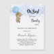 For a baby shower celebrating a baby boy. A white background. A teddy bear holding a blue balloon. Personalize and add the name of the mom to-be and party details. The name and the text: Oh Boy! and Bearly are written with a hand lettered style script.