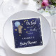 For a baby shower celebrating a baby boy. A navy blue background. The blue color is uneven. A teddy bear holding a blue balloon, yellow stars and faux glitter sparkles. Personalize and add the name of the mom to-be.