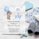 For a baby shower celebrating a baby boy. A faux silver metallic looking background. A teddy bear holding a blue balloon stars and faux glitter dust. Personalize and add the name of the mom to-be and party details. The name and the text: It's a Boy! are written with a hand lettered style script