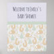A cute poster welcoming you to a baby shower. The bottom half is decorated in a fun pattern illustrated with adorable foxes, cute little birds and whimsical green trees. The top half has a lavender purple background