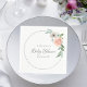 A trendy, simple and elegant paper napkin for a baby shower. Decorated with a simple watercolored wreath of roses blush pink with green olive foliage. Elegant white background. Templates for the mom-to-be's name and a date. With the text: Baby Shower written with a hand lettered style script. Gray colored letters. Gender neutral, for both boy and girl.