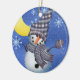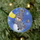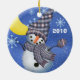 An adorable baby snowman against a night sky full of falling snowflakes on a porcelain ornament that you can change the date on to the current year before ordering.