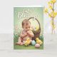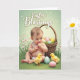 This card shows a soft spring scene with a baby seated on lush green grass, gazing off with a curious, gentle expression and one finger resting near the chin. Two fluffy yellow chicks stand close on either side, angled inward as if keeping the baby company, adding a sweet note of friendship to the moment 🐇. Around them lie pastel egg shapes in mint green and blush pink, each decorated with small floral patterns that echo the season 🌷. Just behind the baby, a woven basket holds more pastel eggs tucked among fresh green sprigs, giving the scene a cozy, shared-picnic feel. The background fades from pale green to lighter tones, dotted with tiny white blossoms and slender pink tulips that rise in small clusters. Across the upper area, a seasonal greeting appears in flowing, cursive-style lettering in a light tone that stands out gently against the green backdrop. The grass is finely detailed with soft shading, and the chicks’ feathers are rendered in tiny strokes that make them look extra fluffy. Pink tulips and white blossoms are scattered behind the basket against the pale green gradient sky.