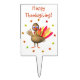 Cake topper with my original digital artwork of a cute baby turkey surrounded by maple leaves. Customizable text says "Happy Thanksgiving!"