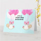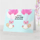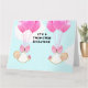 Newborn twin girls congratulations card featuring girl twins, pink balloons and funny line.