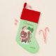 This velvet lined hanging Christmas stocking has a cute Santa Clause holding a green sign that says Baby's 1st Christmas. He is standing next to a decorated Christmas tree along side little animals which include red birds, a bunny, and squirrel. Customize your name and the year with the templates.