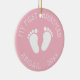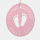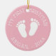 Baby's 1st Christmas tree cute footprints ornament. Add your own photo image on the back optionally. Little foot steps design with stylish typography template for name and date. Fun keepsake for first Christmas of newborn child. Customize background color to girly pink or blue for new baby girl or boy. Happy Holidays! Gold glitter string included. Custom xmas decorations for new mommy and daddy / parents.