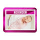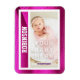 Commemorate your beautiful baby's birth with by immortalizing him or her on their very first baseball card. Simply add your own baby's photo, and edit the first and middle name and also the team name, which also happens to be the family's last name. The magnetic card's border is a pink mesh fabric image that is commonly used for sports uniforms.