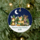 Baby's First Christmas Watercolor Woodland Forest Animals Pine Trees, Moon, Starry Sky and Snow Ornament. Animals include Bear, Deer, Baby Deer with Green Bow, Moose, Raccoon, Bunny Rabbit with forest greenery. Add Name.