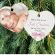 This beautiful baby's first Christmas newborn gift ornament features pretty script lettering and a simple and modern design. A sweet pink illustrated bow sits on the bottom of the heart shaped ornament. Personalized baby name, first Christmas script, birth stats, and birthday are easily personalized on the front of the ornament. The back is one full photo of the newborn baby girl. This elegant ornament makes a beautiful gift for a new mom or expecting parents, and can also be a thoughtful gift from parents to friends and family as an announcement of your child's birth.