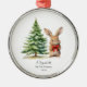 Baby's First Christmas Ornament features an adorable watercolor rabbit standing beside a festive Christmas tree. Bunny is wearing a red ribbon neck bow . Personalize with your baby information and date. A wonderful keepsake gift for your baby's 1st Christmas.