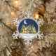 Baby's First Christmas Watercolor Woodland Animals Forest Animals Pine Trees Moon, Starry Sky and Snow Pewter Snowflake Ornament. Baby Animals include Bear with Green Bow, Deer, Moose, Raccoon, Bunny Rabbit, Fox and Owl with forest greenery. Add Name.