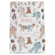 This gender neutral Baby's First Christmas gift bag features a hand-drawn pattern of Christmas baby bodysuits, adorable winter stuffed animals (penguin, reindeer, teddy bear) and bibs hanging on a clothes line with customizable names and event date. The background features a pattern of baby bodysuits, stuffed animals, bibs, bottles, pacifiers and xmas gifts, all against a white background with scattered cute little stars.