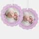 Modern keepsake baby's first Christmas personalize paper ornament in curve letters and line art of snowflakes overlaying a dusty blush pink with your favorite photo.