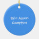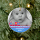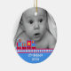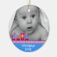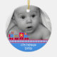 Sweet baby's first Christmas ornament made out of a round shaped ceramic with a pretty gold cord. Graphics of a colorful toy train bordering a blue background, at the bottom of the ornament, and a custom photograph, at the top of the ornament. White text on the bottom blue area and on the backside is fully customizable. Personalize all the text and the photo of your baby, for a sweet first Christmas or as a lovely gift for the new parents or grandparents.
