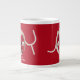 This festive Baby Boy's First Christmas Photo mug is decorated with the word JOY on a maroon-red background. Easily customizable with your photo, name, and year.