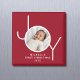 This stylish Baby's First Christmas Photo Magnet features the word "JOY" on a red maroon background.