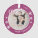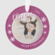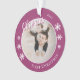 Baby's First Christmas Purple Name Photo Ornament. The background is purple with white snowflakes. Personalize the ornament with your photo, name and year of birth.