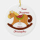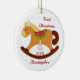 Personalize this baby's First Christmas tree ornament featuring a cute wooden rocking horse image with your child's name and date. Formatted text all ready for you to edit in the easy Zazzle text editor. Created in part with graphics by Scrappin Cop at www.scrappincop.com and www.colorfulclipart.com.