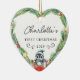 Commemorate your baby's first Christmas with this elegant, customizable round ceramic ornament. The design features a charming, minimalist wreath with a sweet penguin, gift packages, handwriting font, offering a blend of rustic simplicity and timeless elegance. In the center of the wreath, you can personalize the ornament with your baby's name, beautifully showcased in a delicate script font.