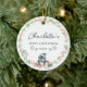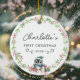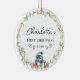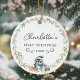 Commemorate your baby's first Christmas with this elegant, customizable round ceramic ornament. The design features a charming, minimalist wreath with a sweet penguin, gift packages, handwriting font, offering a blend of rustic simplicity and timeless elegance. In the center of the wreath, you can personalize the ornament with your baby's name, beautifully showcased in a delicate script font.