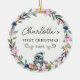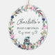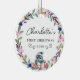 Commemorate your baby's first Christmas with this elegant, customizable round ceramic ornament. The design features a charming, minimalist wreath with a sweet penguin, gift packages, handwriting font, offering a blend of rustic simplicity and timeless elegance. In the center of the wreath, you can personalize the ornament with your baby's name, beautifully showcased in a delicate script font.