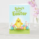 This card features a round little yellow hatchling at the center, shaded in a soft yellow gradient with rosy cheeks and an open beak that looks like it’s chirping happily. It stands on rolling green hills, giving the scene a cozy, together-at-home feel, like a small celebration shared with family or close friends 🐰. Around it sit six decorated egg shapes in pink, turquoise, and lime green, covered with tiny stars, small flowers, and dotted patterns. The sky above fades from pale to light blue, setting a calm spring backdrop behind the characters. Small blossoms in pink, white, and blue are scattered through the grass, adding gentle detail near the hatchling’s feet 🌷. Across the top, the text “Baby’s First Easter” appears in rounded green letters, centered and easy to read against the blue sky. The letters sit above the hatchling’s head, while the eggs are arranged to the left and right like friendly companions on the hillside. The foreground shows bright green grass with little flower clusters and the patterned eggs nestled along the slope.