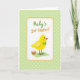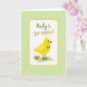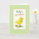 This greeting card features a softly rounded rectangular frame outlined in warm orange with a dotted inner border that draws your eye inward. Inside, a plump yellow chick stands with a tender, friendly look, like it’s posing proudly for someone close. Its tiny orange beak, black dot eyes, and soft pink cheeks add a sweet, affectionate expression, and a teal bow tie at the neck gives it a dressed-up touch. The chick stands on a small green patch that reads like fresh spring grass, with a cracked light-brown eggshell resting nearby to hint at a just-hatched beginning. Above the picture, the text “Baby’s 1st Easter!” sits near the top, written in a casual hand-drawn style with green and orange lettering. The background is a pale pastel green filled with neat white polka dots, bringing a gentle spring feel 🌷. The orange border, dotted line, and the little eggshell sit crisply against the dotted green backdrop 🐰.
