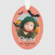 Baby's First Halloween Black Bats Photo Ornament. A custom baby's name in a trendy script and 3 black bats. Personalize the ornament with your baby's photo, name and year. A lovely Halloween holiday keepsake.